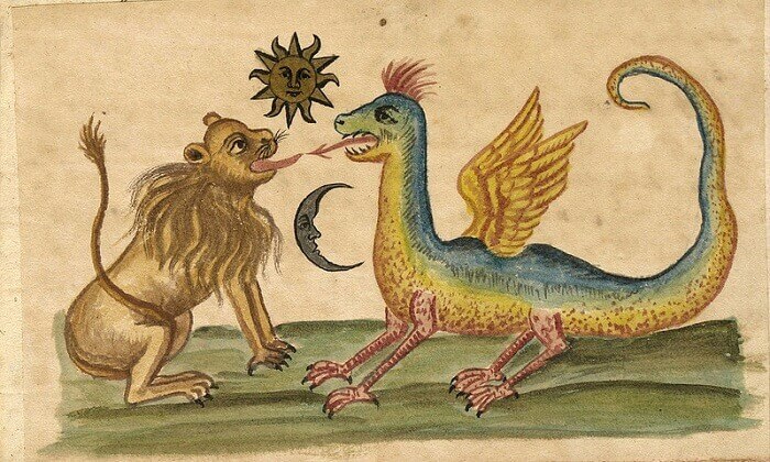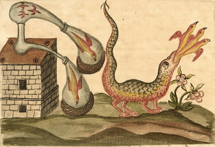 The recipes, recorded in the hermetic treatises seem mysterious, too. English alchemist, George Ripley (15th century) proposed to inflame mercury until it transforms into initially green and then into red lion for the creation of the sages’ elixir. He suggests the emerging fluids to be mixed resulting in „tasteless mucus, alcohol and red drops”.